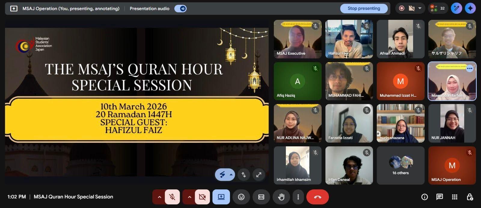 JAPAN, 10 March 2026 – In conjunction with Ramadan and the commemoration of Nuzul Quran, the Malaysian Students’ Association in Japan (MSAJ) facilitated a spiritual initiative titled "MSAJ’s Quran Hour Special Session." Held via Google Meet, the program aimed to strengthen students' connection to the Quran and provide spiritual encouragement for those living abroad.