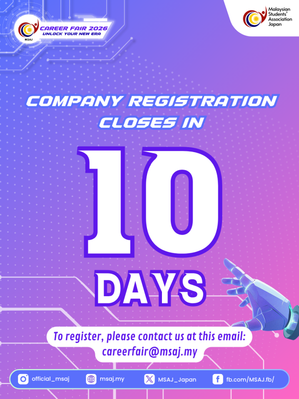 There are only 10 days left to register for MSAJ Career Fair 2026. This is a great opportunity for your company to meet and interview Malaysian students and professionals currently living in Japan.